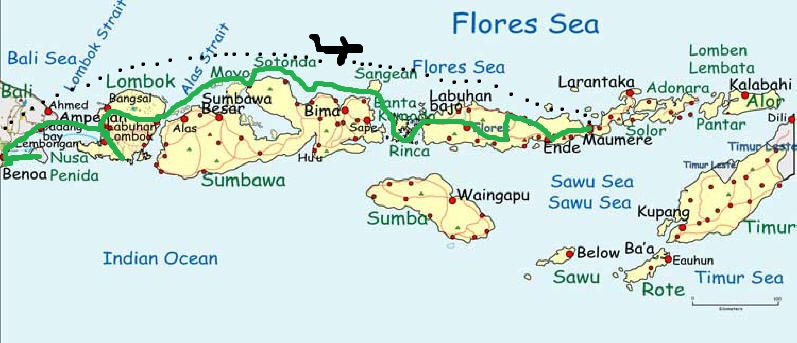 Nusa Tenggara. Za boljšo predstavo sem pot označila z zeleno. Torej, mesec dni, Bali - Flores - Rinca, Moyo, Satonda mimo Sumbawe - Lombok - Bali. Gre za